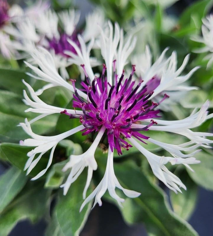 nádherná chrpa s kontrastními ametystově fialovými květy, okvětí je bílé. Vykvétá koncem května a vydrží celý červen, po setřihnutí často opakuje květenství na podzim. Výška v květu 45 cm.