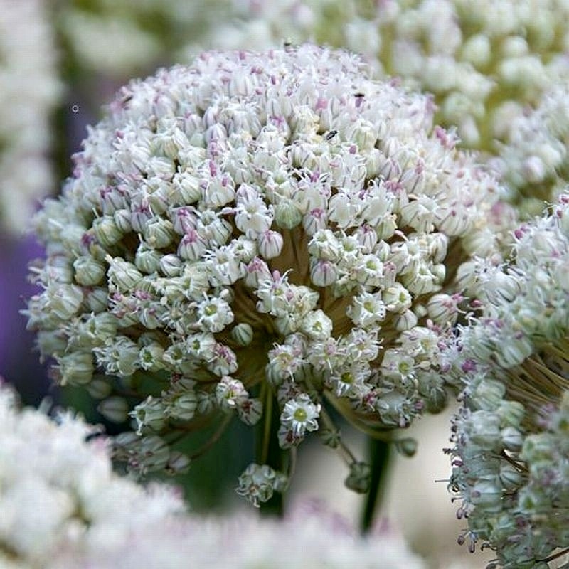 je to neobvyklé allium, také nazývaný divoký pór. Květinová hlava je stříbřitě růžová, držená na silných stoncích, ideální pro zadní část záhonů. Je to dobrá řezová květina. Výška okolo 1 netru.
