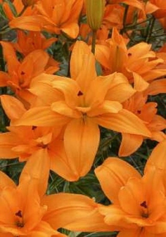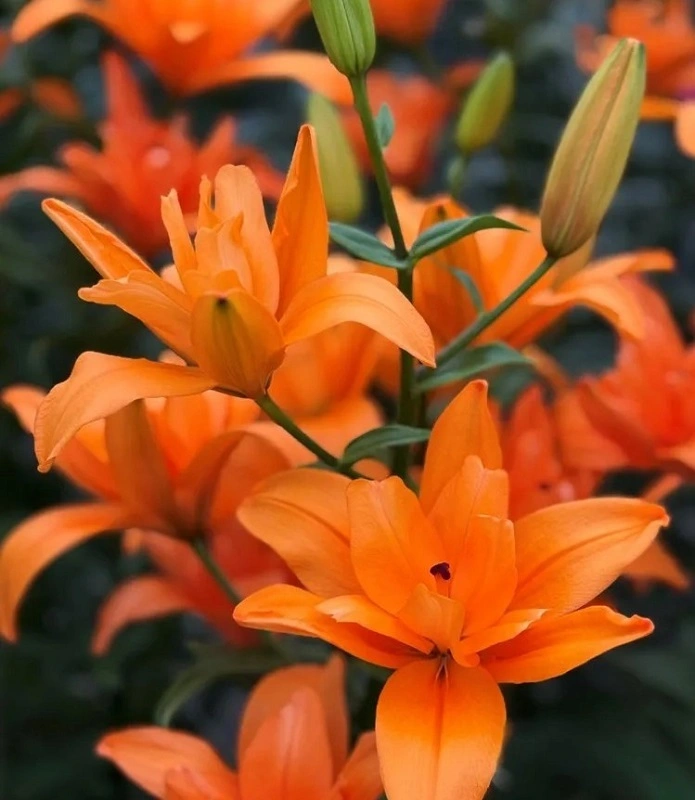 velmi tmavě dýňově vybarvené, vzdušně plné květy na tmavě zbarvených lodyhách až 130 cm délky.