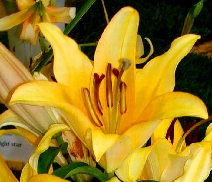 květy jsou miskovité, mangově oranžové. Výška 120 cm, tmavé olistění a tmavé lodyhy. Krásná lilie.