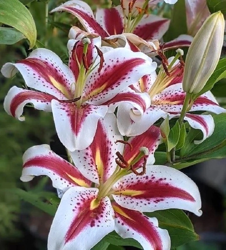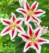 bílé, 16 cm velké květy mají rudé plameny a karmínově červené tečkování umocněné zářivě zlatou hvězdou uprostřed. Výška 1 metr. Novinka.