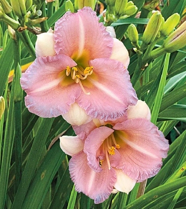Heemskerk 2026,DIP,SEV,E,RE. Je ohromující denivka, která upoutá pozornost ve vaší zahradě svými nádhernými krémově růžovými květy, pěkně zvýrazněnými okouzlujícími fialovo-modrými okraji s lehkým kouřovým nádechem.