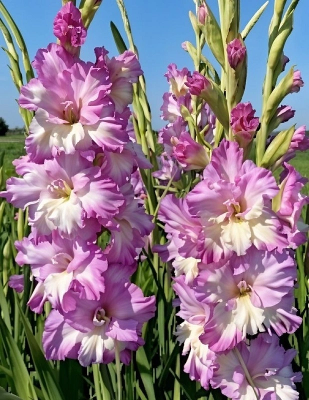 Vigo 2025,465,M. Silně zřasené, tmavě růžově levandulové květy s kontrastním smetanovým středem. Dlouhé klasy s 22 poupaty.