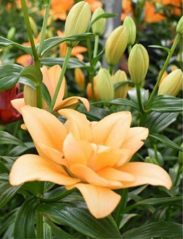 nádherné a velké květy mají míchaný, ale velmi čistý odstím broskvově meruňkový. Pevné stonky, výška 110 cm. Novinka 2026.