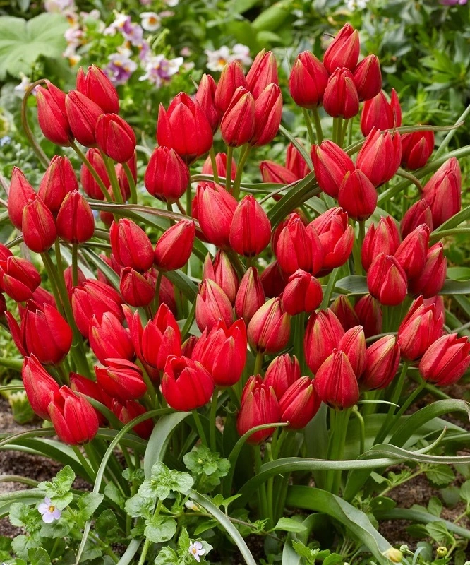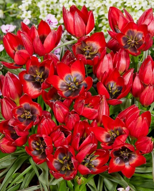 Františka - brzy na jaře tento malý tulipán vynikne nad svou váhu a nese mnoho jasně šarlatových květů, které se na slunci otevírají a odhalují tmavé lilkové středy, čímž vytvářejí výrazný kontrast.