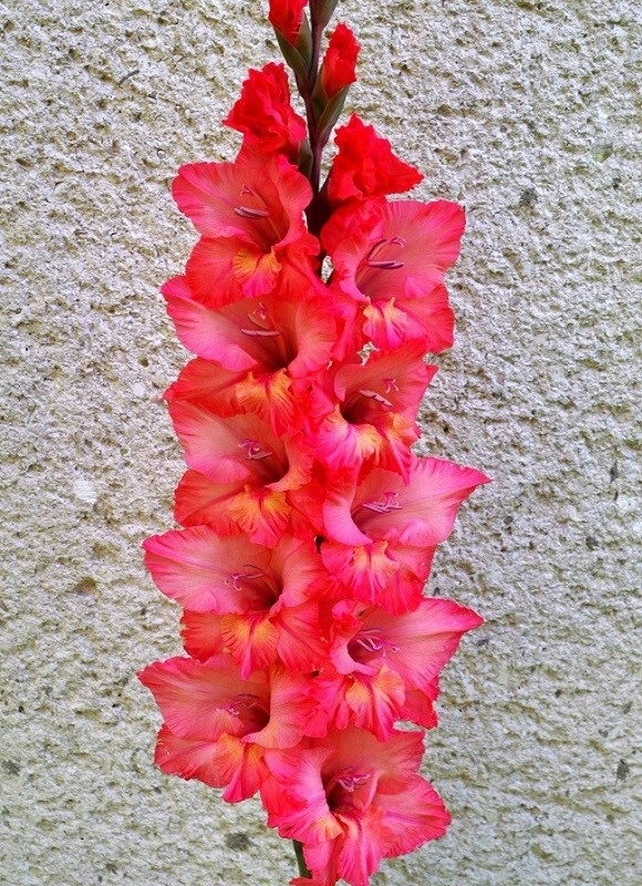 Mimránek 2026,463,M. Barva je zářivě růžově levandulová, se světlým žlutavým znakem v hrdle a malým fialovým jazýčkem. Rostlina je vysoká 135 cm, 10 květů drží otevřených, z celkem 21 pupenů. Umístění spodního květu v klasu je perfektní, soukvětí souměrné, tvrdé zdravé červeně fialové hlízy. Dává dostatek brutu pro další množení. Semenáč DLS-8 (Stavros x Crazy Eight).