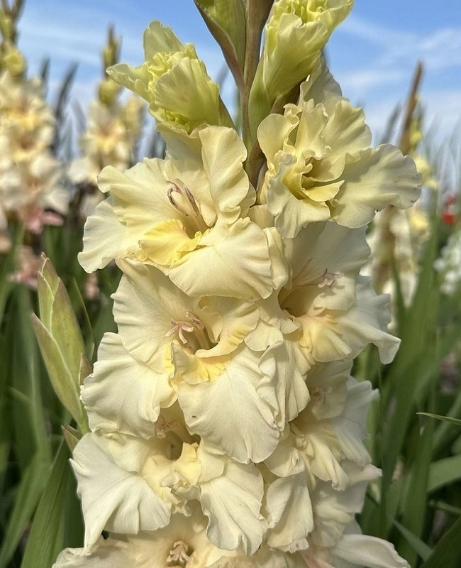 Holland 2025,310,M. Voskové a zřasené květy jsou krémově bílé ve vynikajícím kontrastu s tmavými klasy se zelenými poupaty. Extra.