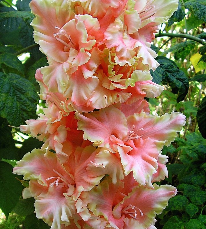 (Kuzņěcov 13,435,M). Krásná kombinace lososové a růžové třpytky se světle zelenými fragmenty podél okrajů okvětních lístků. Klasy jsou silné a odolné s hustým dvouřadým uspořádáním silně zřasených květů. Textura okvětních lístků je velmi hustá. Neobvyklé, velmi krásné zbarvení květu! Mistrovské dílo.
