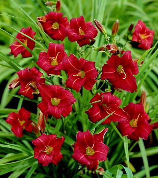 (Aden 81,DIP, EV). Velmi vkusně tvarované purpurově červené, pouze 7 cm velké květy, mají bílé okraje a malé zelené hrdlo. Výška 30 cm, vhodná na skalky a do nádob. Velmi bohatě kvete uprostřed denivkové sezóny.