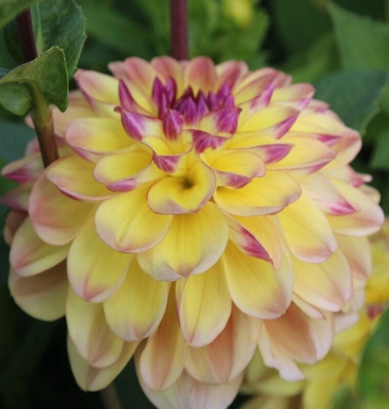 její dekorativní květy se pyšní zářivě žlutými okvětními lístky, jemně ozdobenými měděnými okraji a špičkami. Harmonická barevné kombinace. Imponující květy mají průměr přes 11 cm a hustě vrstvené okvětní lístky vytvářejí velmi plné květy. Výška 1 metr.
