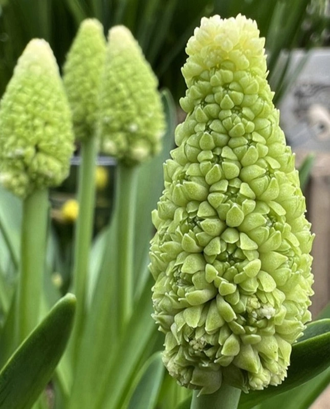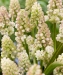 je rafinovanou verzí klasického hroznového hyacintu, která se vzdaluje od obvyklých modrých odstínů. Jeho husté, pyramidalní hroznatiny plnokvětých, z počátku zeleně šedobílých květů mají jemnou, téměř éterickou kvalitu. Později, pokud se podíváte pozorně, mají nejvýše položené malé zvonky jemně lemovaní nádechem purpurově růžové. Okázalý hybrid 'Lady Madonna' má svoje kouzlo, které pozvedá jakýkoli záhon, květináč nebo skalku svou elegantní vyvážeností. Výška 15-20 cm. Extra novinka.