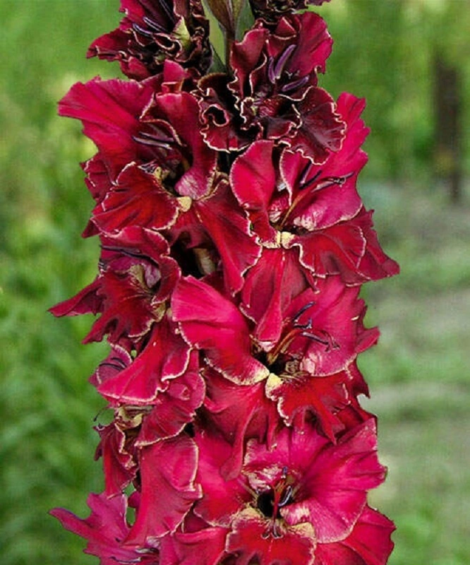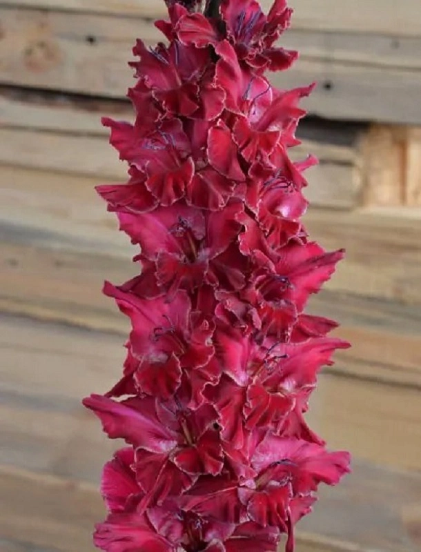 Kuzněcov 13,566,M. Odvážný Husar - šťavnatý brusinkový odstín okvětních lístků zdůrazňuje jemný stříbrný okraj a kontrastní fialové tyčinky. Okvětní lístky jsou husté, silně zřasené. Květenství je husté a dvouřadé. Současně je otevřeno 10 květů. Kvete 80-90 dní. Výška 170 cm.