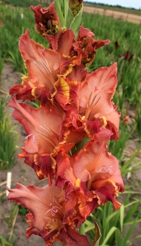 Koníček 22,395,EM. Neobvyklá kombinace měděně kouřové s výraznou zlatě žlutou kolorou okrajů a středovým tmavším vybarvením. Konce okvětních plátků jsou protaženy do špiček. Otevírá 7 až 9 moderně zvlněných, voskovitých květů. Klasy jsou pevné, mají 19 až 21 poupat. Velmi zdravý gladiol, který je vynikající pro aranžmá, ale najde též uplatnění pro řez, ale i na výstavních stolech. Ojedinělá kombinace hnědé se žlutou!