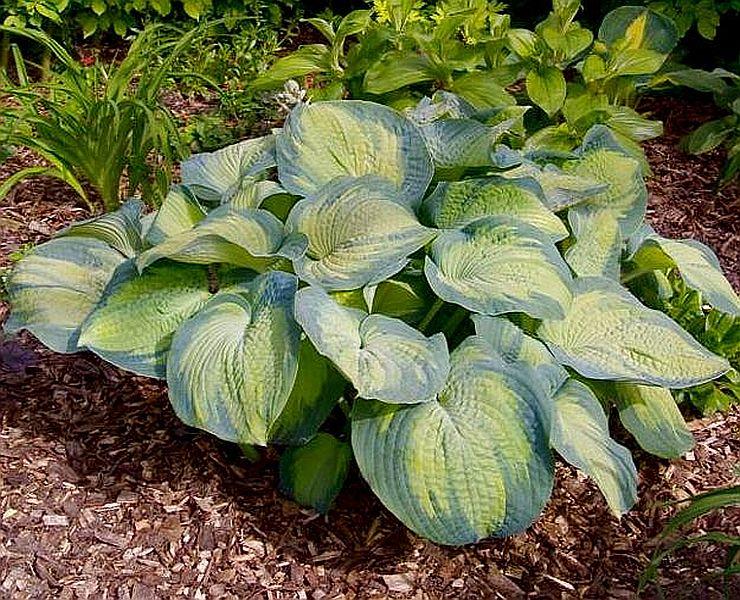 velké srdčité listy jsou olivově zelené s tmavě zelenými okraji, později, zejména na slunci přechází do svítivě žlutě zeleného odstínu s modře zelenými lemy. Mohutnost až 70x100 cm, kvete bledě lilavými, později téměř bílými květy.