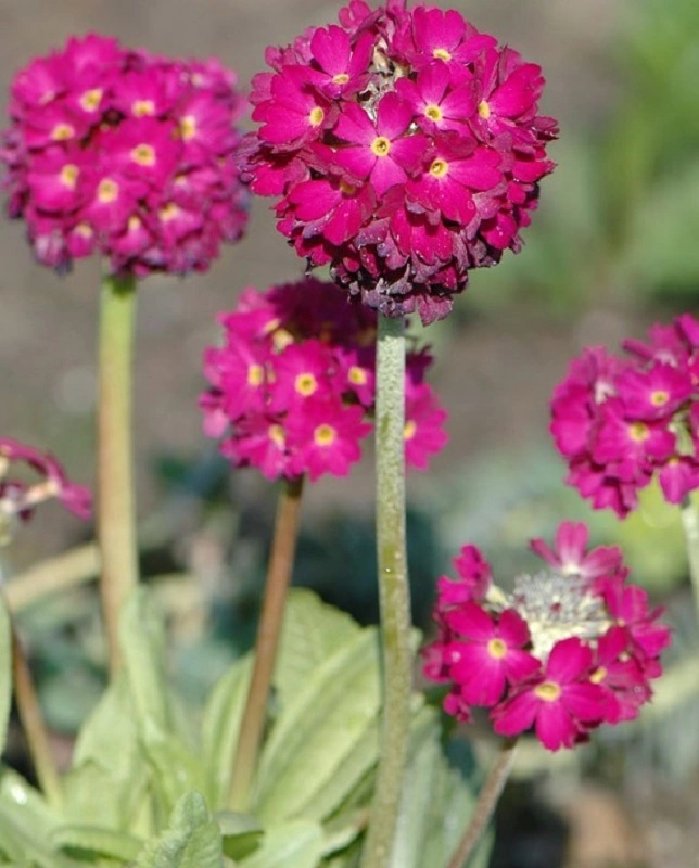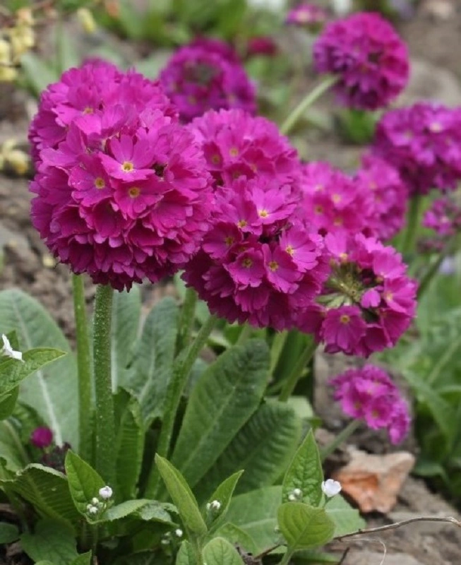 primula denticulata – prvosenka zoubkatá - výškou 25 cm vhodná do skalky, kvete v březnu-květnu tmavě růžovými kulovitými květenstvími. Plně mrazuvzdorná, miluje slunná stanoviště, snáší i světlý stín.