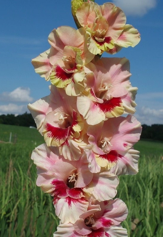 Mitiska 2026,411,LM. Krémový v téměř neviditelném základu, velké červeně-fialové oko, žlutě lemované, celý květ je nádherně fialkově probarvený. Opravdu super kombinace, velmi silný vosk, dobrý nákvět. Klasy jsou střední délky, vysoce dekorační odrůda. Semenáč O18.