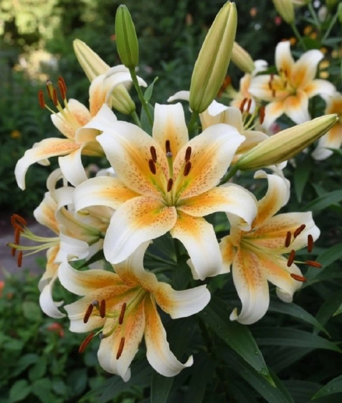 nádherný orienpet ve stylu White Henryi. Velké smetanově bílé zvonkově turbanovité květy jsou směrovány dolů a do stran, ve středech jsou bohatě skořicově posypané na tříslově zlatém pozadí. Výška v prvním roce 130 cm, ve druhém 160 cm, ve třetím i 180 cm. Nadprůměrná novinka 2013.