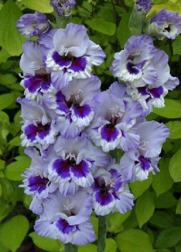 Mimránek 21,381,EM. Ačkoliv je tento kultivar vedený jako miniatura, květy mají 8 cm v průměru na dlouhých klasech s 22 i více puky. Co je však na tomto kultivaru zvláštní, to je vybarvení švýcarských macešek. Jemně nařasené květy mají základ nebesky modrých tónů s krémově bíle lemovanými, a velmi kontrastními, indigově fialovými oky a s purpurovými středy – akvamarínově modrými krystaly. Výška 160 cm.