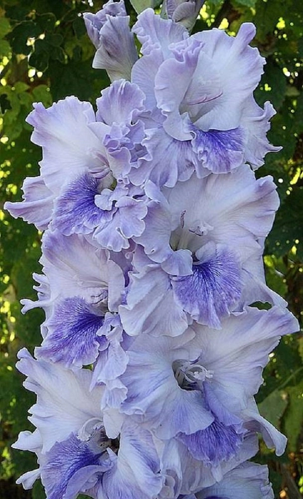 Lazerevič 15,581/483,M. Velké jemně modré květy s intenzivnějším odstínem u okrajů okvětních lístků. Na okrajích okvětních lístků jemný je světlý lem. Spodní lístek je zdoben modrofialovou zpeřenou skvrnou. Krásné krajkové zřasení. Dvouřadé, hustě uspořádané květenství. Klas je mohutný a dlouhý s až 23 poupaty, 8 najednou otevřených květů. Výška 140 cm.