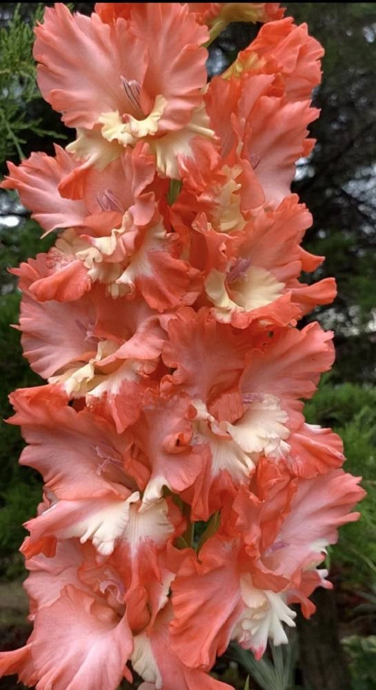 Baranov 21,445,EM. Velké, sytě lososově růžové květy s bílými spodními lupeny. Silné zřasení okvětních lístků s jemně jehličkovanými okraji. Dlouhé klasy s 23 puky s 8-10 najednou otevřenými květy. Výška 150 cm. Parádní odrůda.
