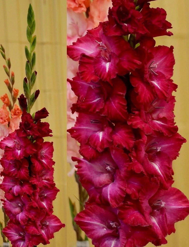 Lelek 2021,556,LM. Velké, malinově červené květy mají ve středech lehounké purpurové nadechnutí doplněné bílými šípy na spodních petálech. Květy jsou po okrajích zřasené, mají jemný sametový černý nádech, jsou uspořádané v přísném dvouřadu, najednou otevřených je 8-9 z 25 poupat.