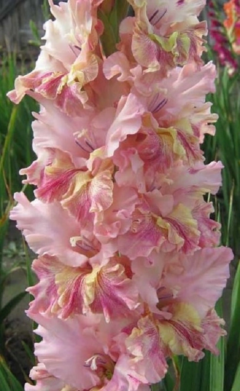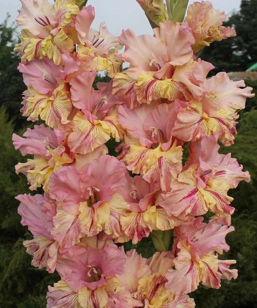 Krašeninnikov 13,463,M. Naprosto zapamatovatelná odrůda vyšlechtěná Borisem Ivanovičem Krašeninnikovem, který už bohužel nešlechtí a se svým automobilem značky Škoda procestovává rodný Altajský kraj přes Mongolsko (právě zde žije bájný červ olchon) až do Číny. Květům vévodí bledě malinová s fialovým nádechem, spodní okvětní lístky s tmavým malinovo-fialovým vzorováním na žlutém pozadí, okraje zbarvené do žluto-zeleného odstínu. Silný, dokonale dvouřadý klas, skládající se z 21 pupenů, hustě a symetricky uspořádaných ve 2 řadách. Originální krásná odrůda s pavoučím vzorem, který se šlechtěním naše firma snaží přenést i do jiných barevných tónů.