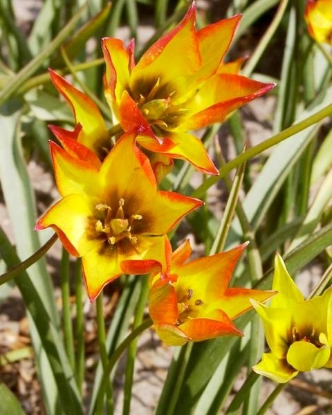 květy jsou báriově žluté s červenými špičkami a zelenými plameny od báze. Výška 30 cm.