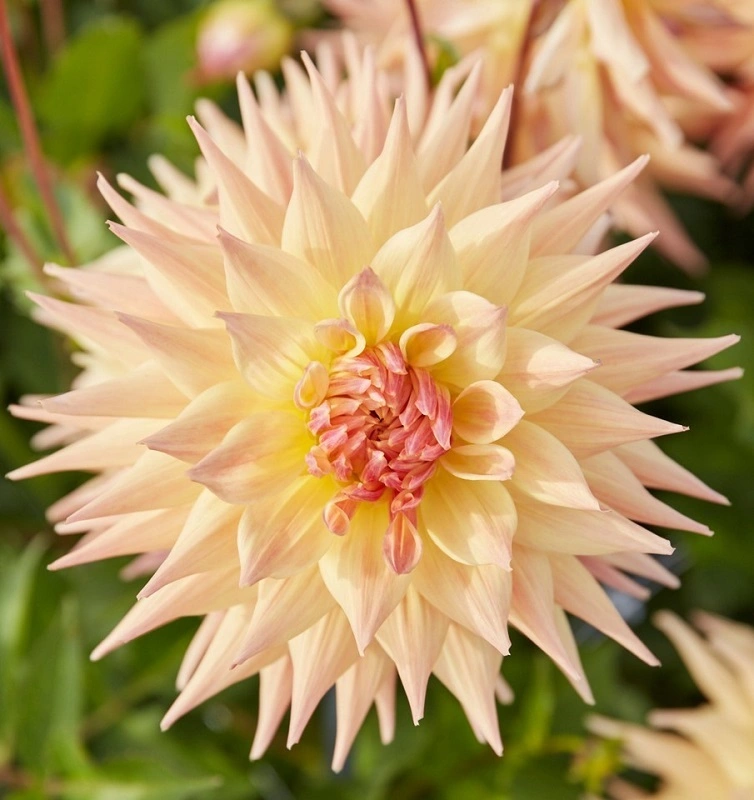 semi-kaktusovka – přes 20 cm velké květy jsou jako pohled na krásný západ slunce s jeho nádherným krémově žlutým středem, který přechází do teplého lososově meruňkových až žlutě oranžových, i mírně červených okrajů. Výška 90-110 cm.