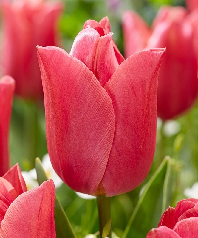 nádherná svěže červená, později s lososově růžovým přelivem, mutace odrůdy Jimmy. Květy mají zvlášní pohárovitý tvar, pevné stonky délky 42 cm. Novinka 2025.