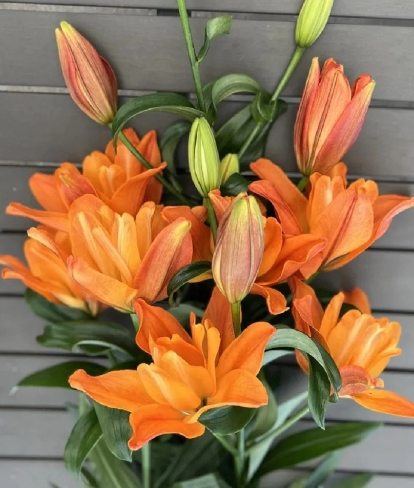 až 150 cm vysoké stvoly nesou velmi tmavé, hokaidově červeně oranžové, neformálně plné květy.