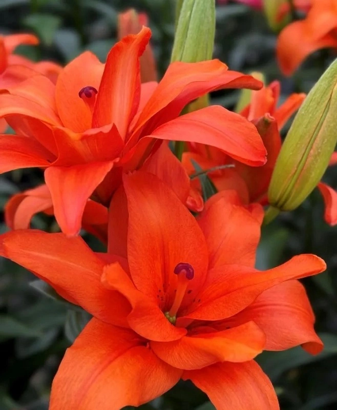 rumělkově červené, formálně plné květy. Výška 120 cm.