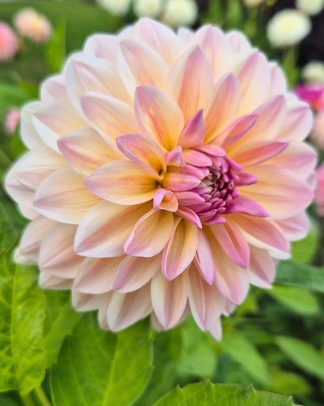dekorační jiřinka, zbarvení od meruňkové po jemně růžovou. Velikost květu 12 cm. Výška 1 metr.