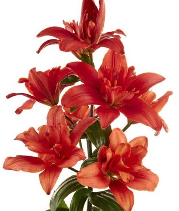 rajsky červené až tropicky pomerančové, netradičně plné květy s výraznými žebry okvětních plátků zajišťujících velkou tuhost a trvanlivost. Výška 120 cm.