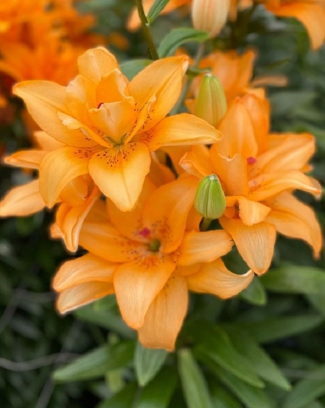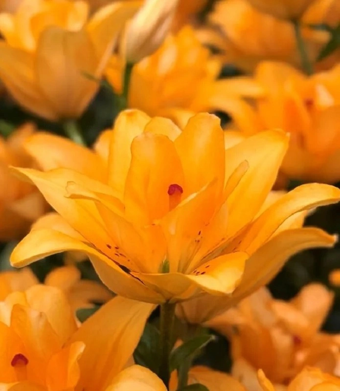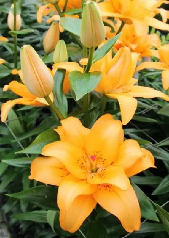 velmi pěkně plné, jantarově zbarvené květy, ve středech s bordó tečkováním. Výška 120 cm.