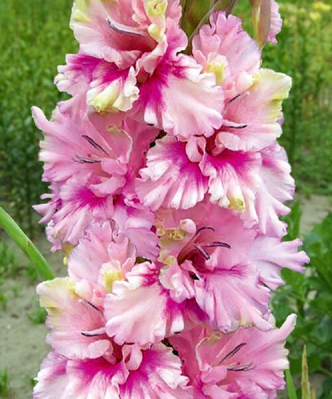 Fotin 13,473,M. Květy jsou jemné, malinově fialové s jemně rozostřeným světlejším odstínem na spodních okvětních lístcích. Po okrajích lístků jsou citronově zelené žilky. Velmi silně zvlněný. Textura lístků je hustá, na slunci diamantově jiskřící. Současně je otevřeno 8-9 květů z 24-26 poupat. Výška 150 cm.