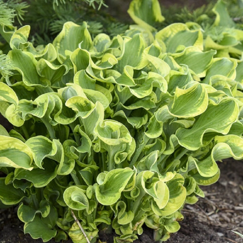 je to opravdu silně zkadeřená bohyška! Její listy jsou světle zelené a mají krémově žlutý, později v sezoně krémově bílý okraj. Více než barva ale zaujme její tvar. Listy mají tak výrazně zvlněné okraje, že rostlina vypadá jako po „trvalé“. Středně pevná stavba listů. Krásná kdekoli. Na jaře velmi zajímavě raší. Výška v dospělosti 35 cm.