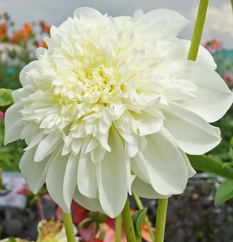 ohromující podívaná díky svým elegantním kulovitým, čistě bílým, 12 cm velkým květům. Velmi plné středy jsou krémově žluté. Výška 90 cm. Novinka.