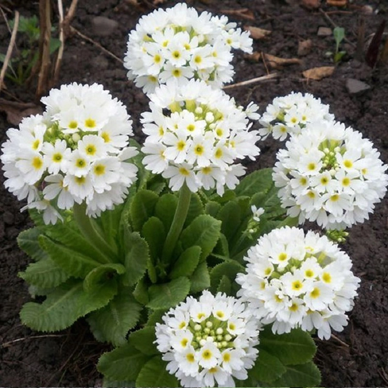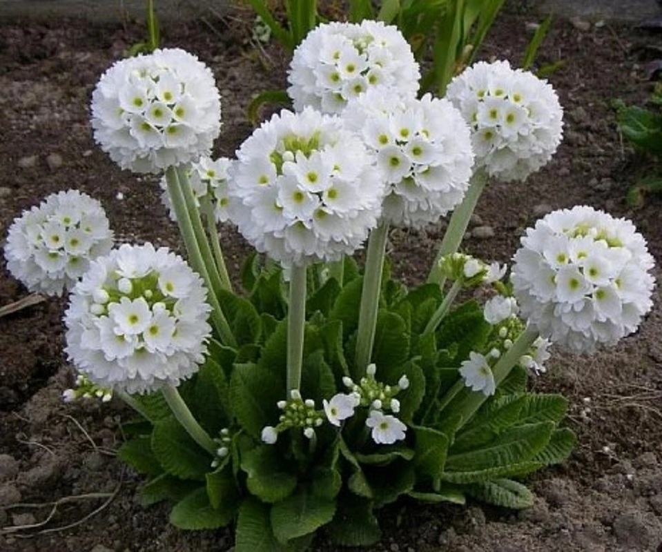 primula denticulata – prvosenka zoubkatá - výškou 25 cm vhodná do skalky, kvete v březnu-květnu čistě bílými kulovitými květenstvími. Plně mrazuvzdorná, miluje slunná stanoviště, snáší i světlý stín.