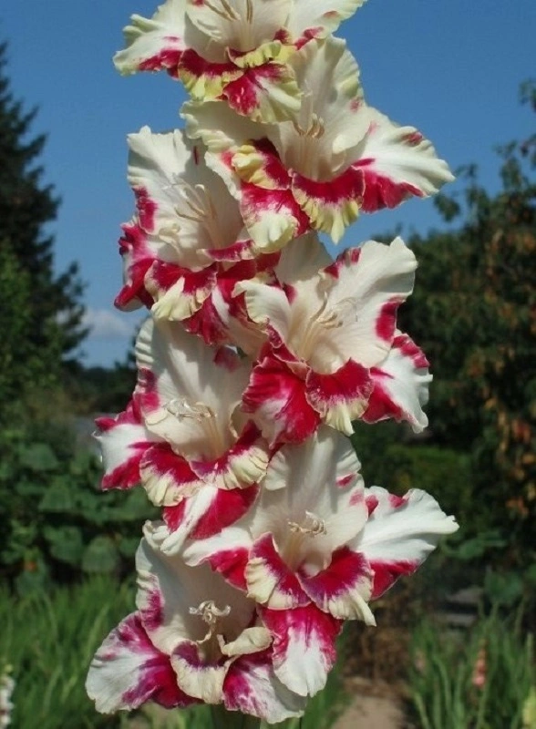 Mitiska 2026,401,M. Slovanská bohyně plodnosti Živa je často vyobrazena jako žena krev a mlíko, tedy v podobných barvách tohoto kultivaru. Má mléčně bílé, jemně zřasené květy s velkými, karmínově červeně fialovými oky, navíc místy smetanově lemované, a často zabarvující i okraje. Krásná a kontrastní kombinace, pevné klasy s 18 puky, spíše střední délky. Krásný dekorační exot. Semenáč D11.